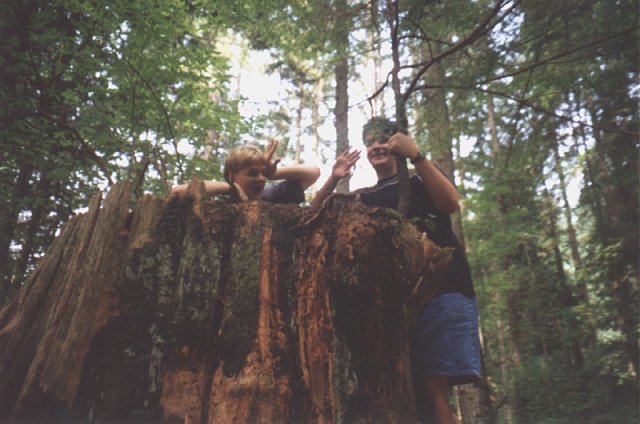 Zaffy and Enigma fooling around on a big tree stump (Simon)