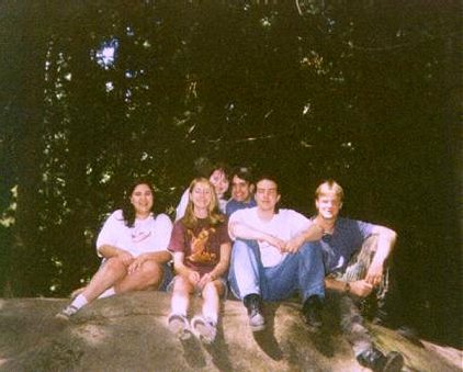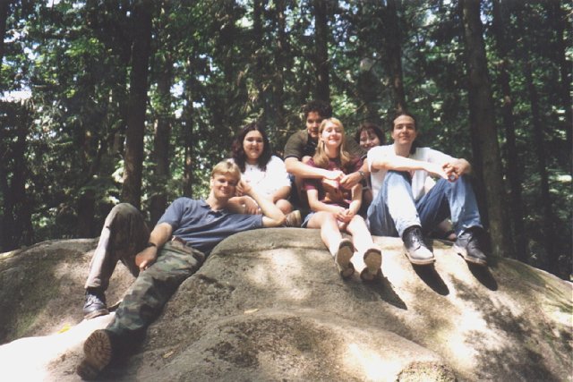 Zaffy, ami, Enigma, Reine, Wolfie & Omni sitting on a large rock shortly before leaving Lynn Canyon (Simon)