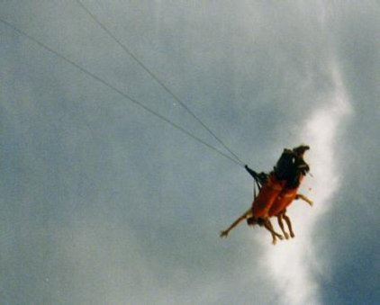 The guys as they are suspended and lifted by the cord into the air (ami)