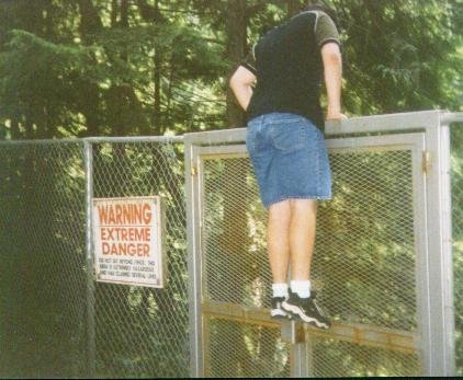 Enigma climbing over the fence despite the warning (ami)